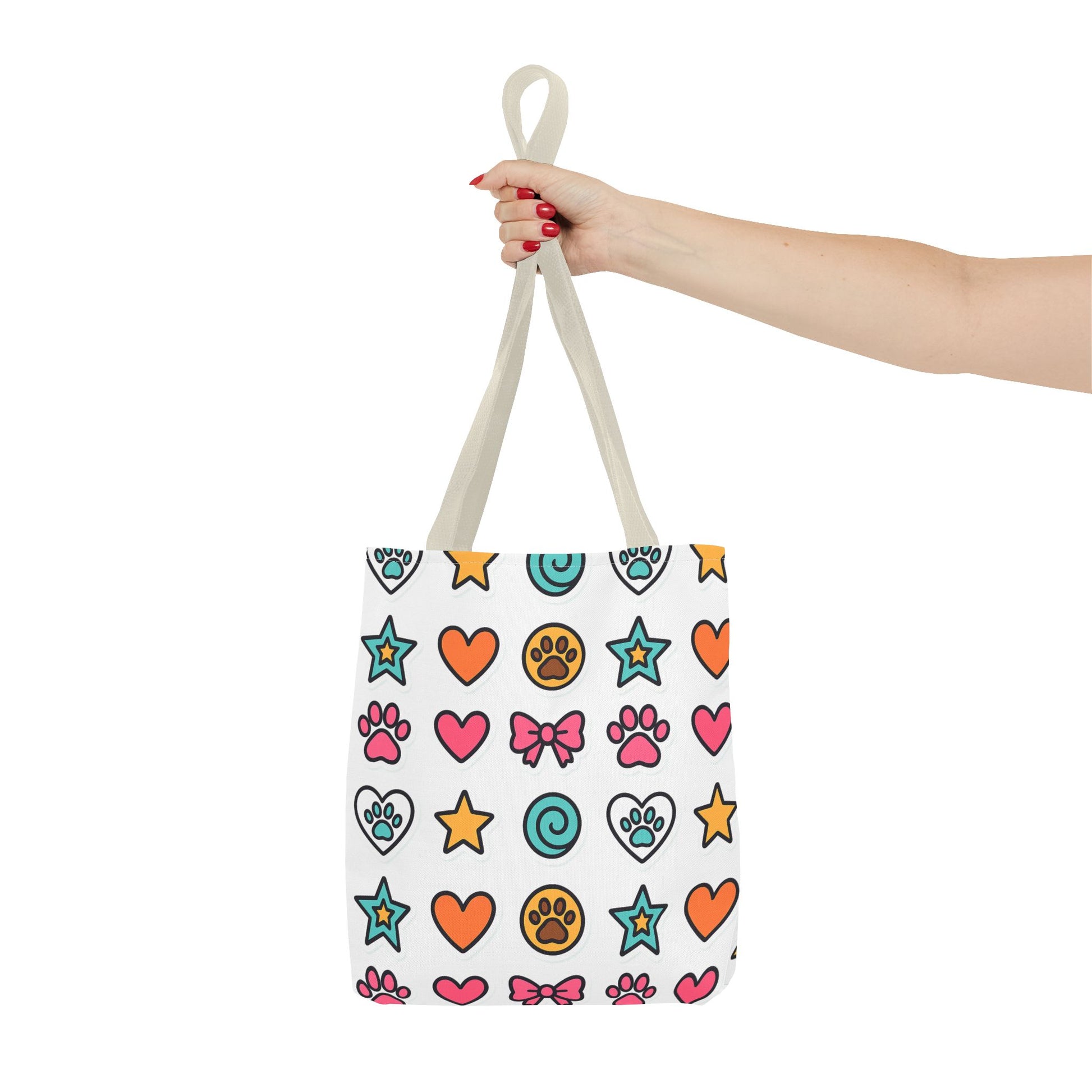 Light-hearted and bright, this tote brings a pocket of playful joy to everyday errands and pet-play outings. Colorful paw prints, bows, hearts and stars scatter across a clean white field, giving the bag a cheerful, slightly whimsical vibe that reads fun without feeling juvenile. The roomy boxed-corner shape and durable polyester body stand up to groceries, toys, and notebooks, while the black handles and reinforced stitching keep strain at the straps low. Carry it to dog park meetups, weekend markets, or casual coffee runs — it adds a splash of friendly color and practical storage to the day.