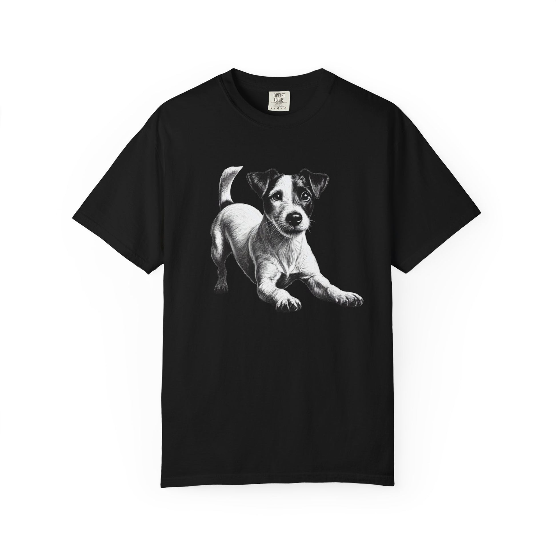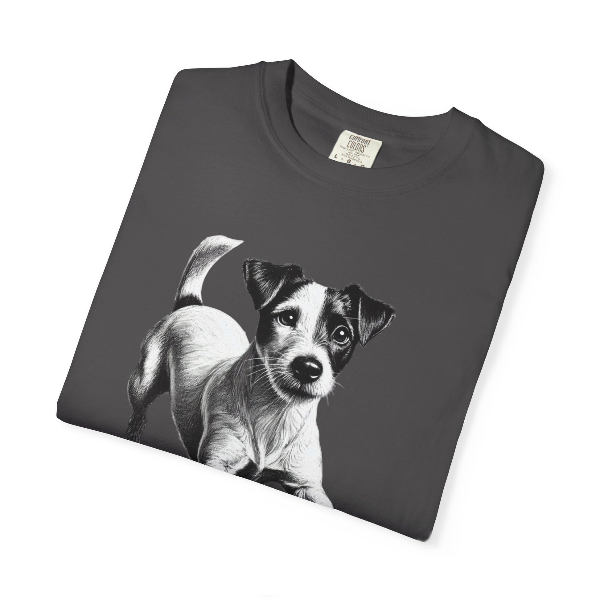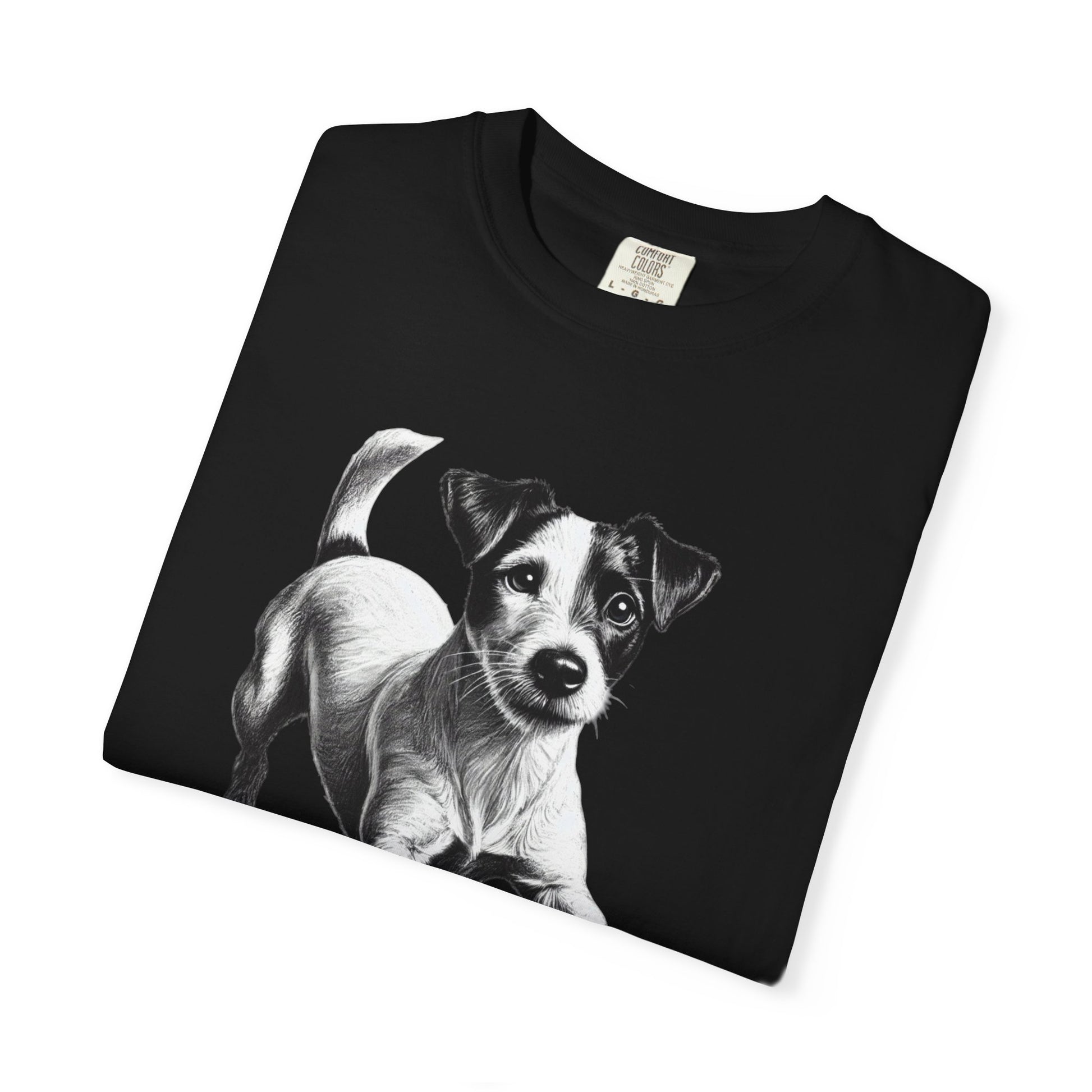 Jack Russell Puppy Graphic T-Shirt — Playful Dog Tee with Paw Print Back