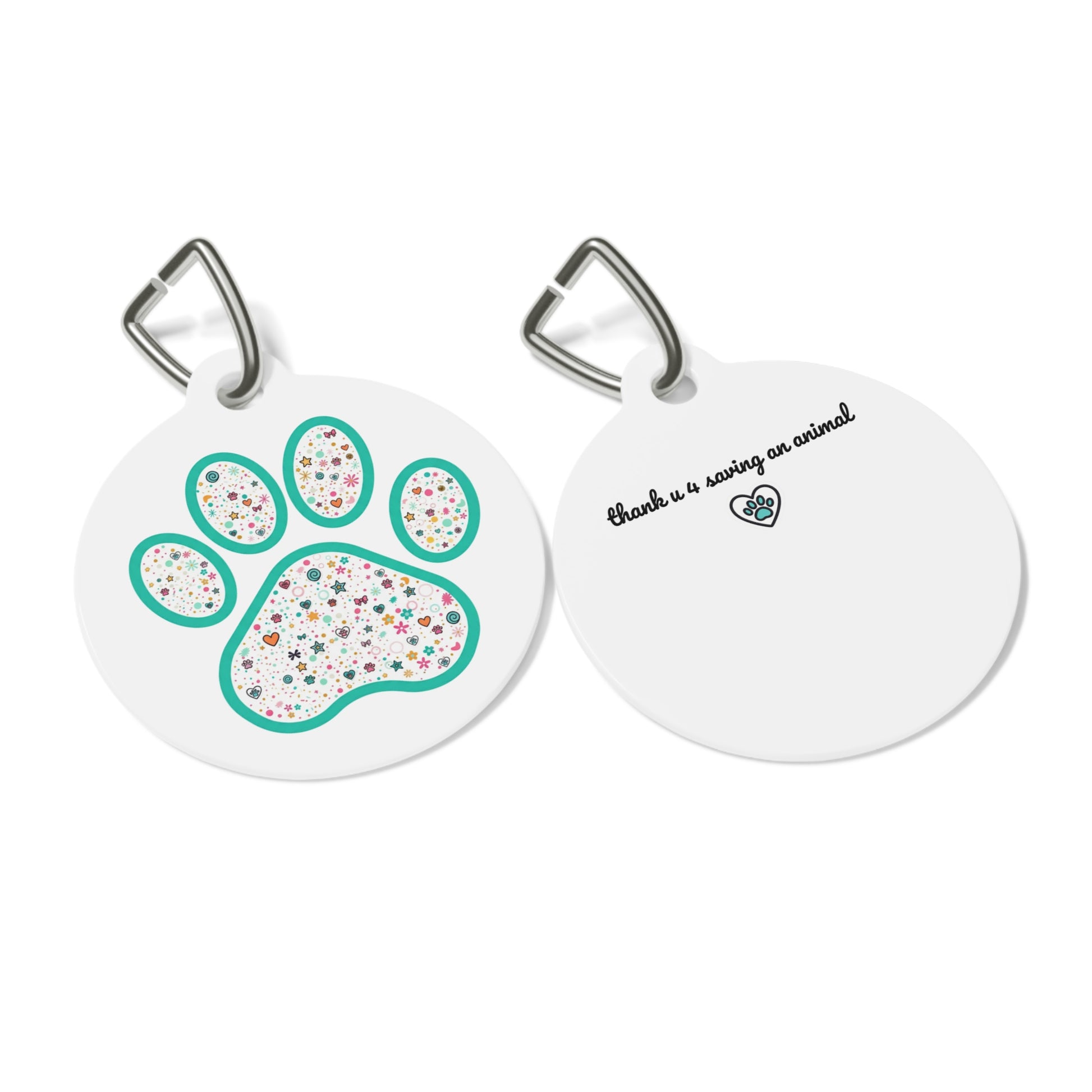 A small, cheerful pet tag that turns your pup or kitty’s collar into a tiny celebration. The front shows a teal-outlined paw filled with a confetti of tiny hearts, stars, and icons—bright, playful, and unmistakably joyful. On the back, a short, heartfelt message and a tiny paw-heart emblem quietly say “thank u 4 saving an animal,” making this tag especially meaningful for adopters, rescue supporters, and foster families. The glossy, full-color print on both sides keeps the design vivid, while the solid metal construction and included metal clip mean this tag travels with your pet through walks, zoomies, and snuggles without fading or falling apart.